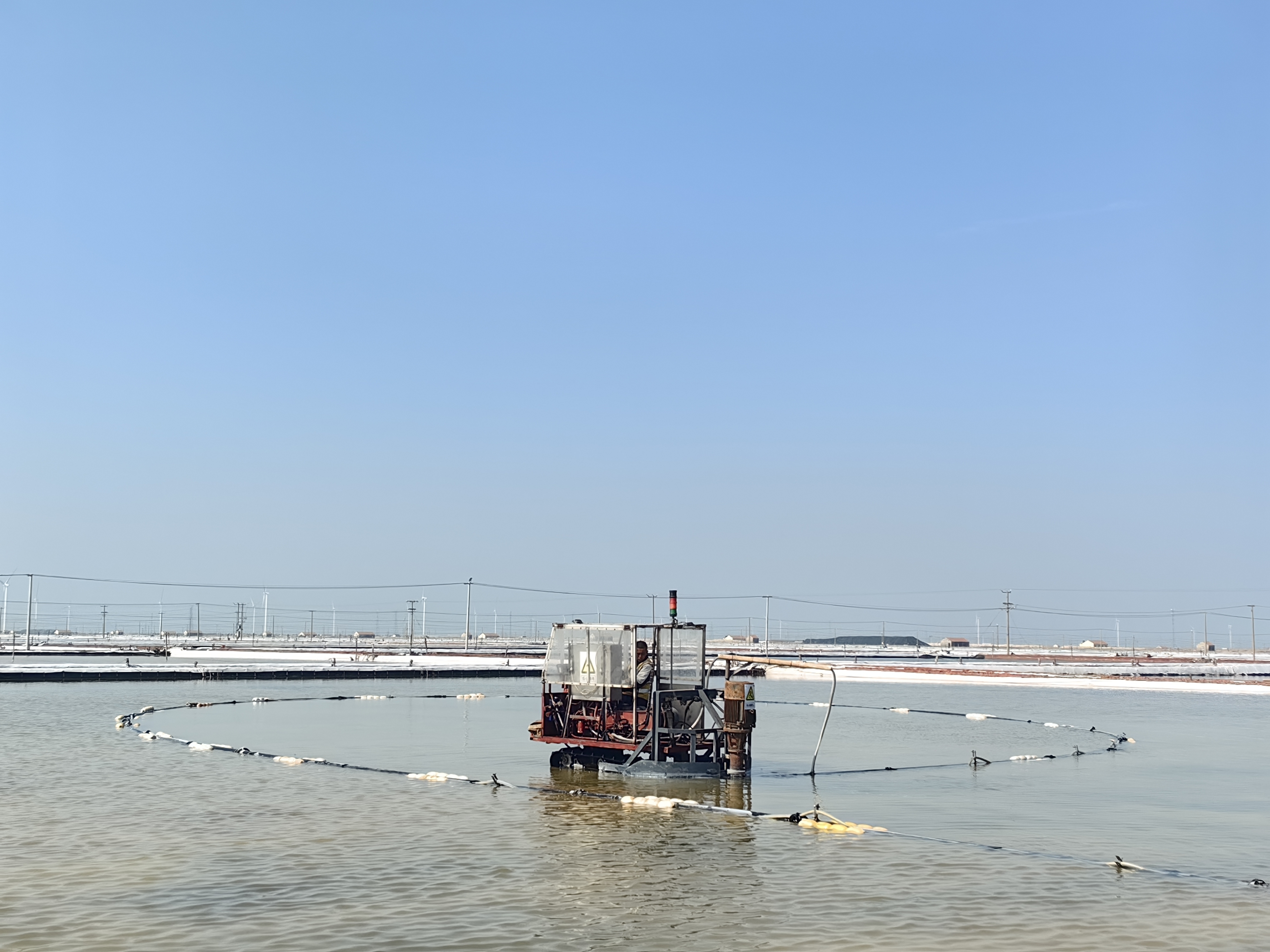 在八班扒鹽現(xiàn)場(chǎng),一臺(tái)唐三零扒鹽機(jī)正在鹽池里進(jìn)行扒鹽作業(yè),唐三零操作手駕駛著機(jī)械,在鹽田中央緩緩行進(jìn)著,不時(shí)的回頭觀察鹽泵吸鹽情況,確保扒鹽管道順暢。遠(yuǎn)處的廩基內(nèi),大廩工正在熟練地利用分流板對(duì)鹽篩中傾瀉下的原鹽進(jìn)行引導(dǎo)分流,熟練地打好廩墻。