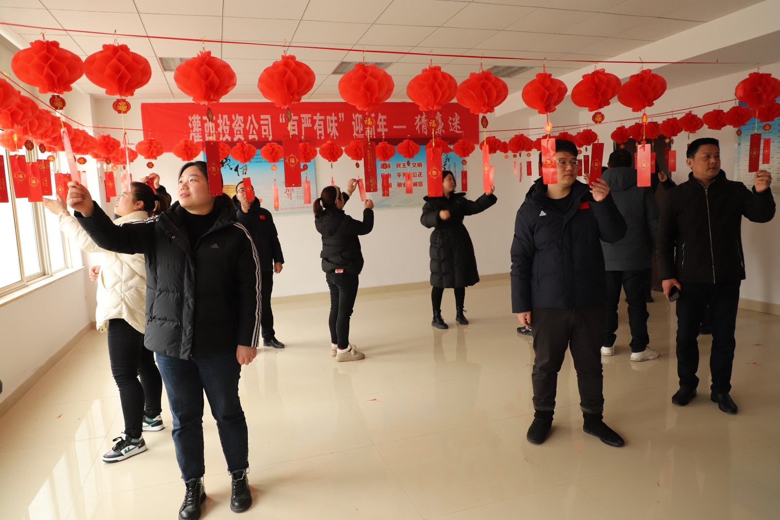 “樹我中華廉政風(fēng)——打我國兩節(jié)氣。”“反腐倡廉常抓不懈——打一中國地名。”1月27日,灌西投資公司辦公大樓廉政文化展廳內(nèi)紅紅的燈籠格外喜慶,近百條廉政燈謎依次懸掛,一場集知識性和趣味性于一體的廉政燈謎有獎競猜活動吸引了百余名員工聚集參與,大家一起開動腦筋,爭相“解密”。