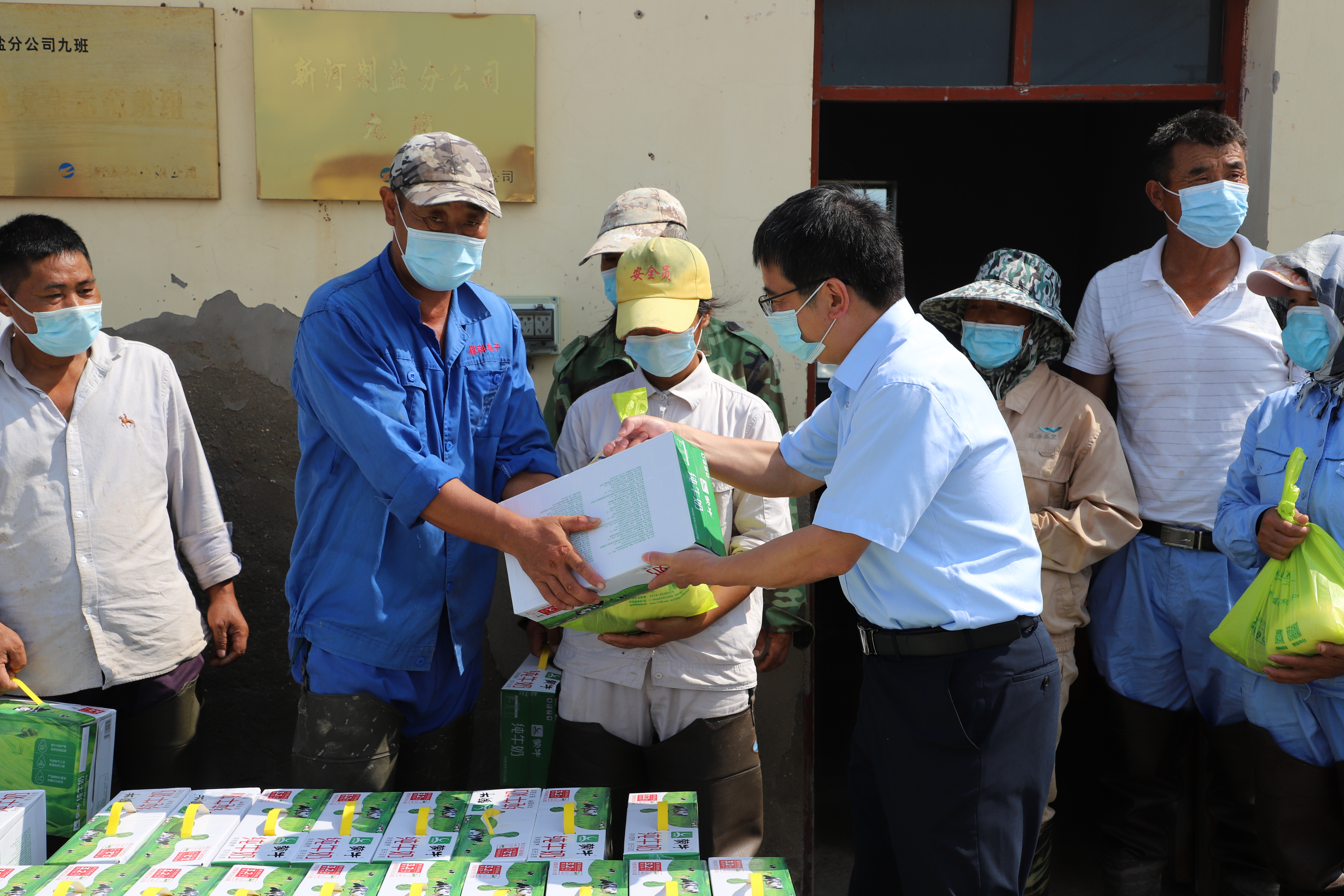 在新河制鹽分公司九班,楊國新代表集團公司向堅持在鹽業生產一線的工人們表示深切的感謝和慰問,感謝他們在烈日下為集團所付出的辛勞,并叮囑他們要避開高溫時段,科學合理安排好工作時間,既要保證生產質量和進度,又要注意防疫和高溫生產安全。