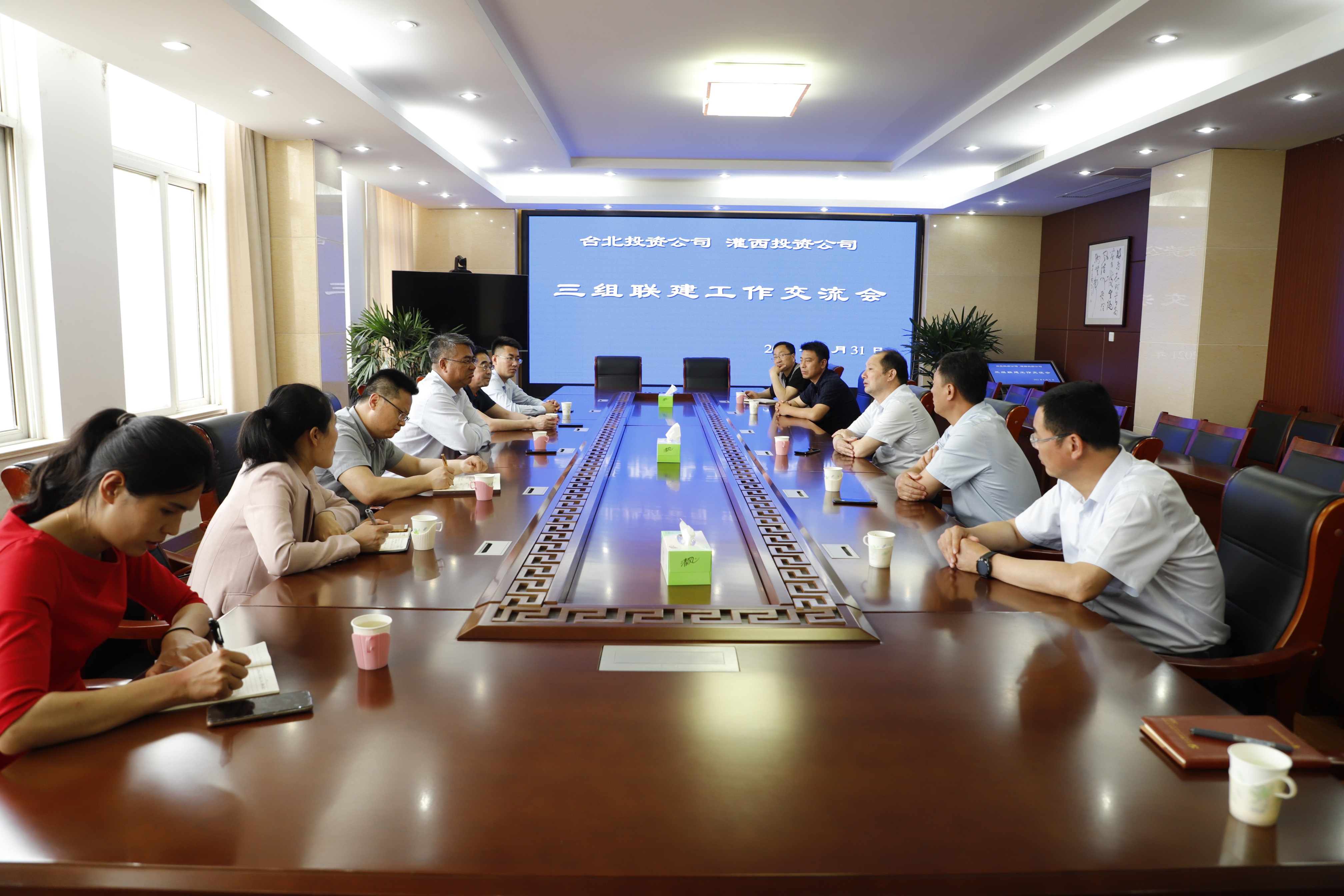 5月31日,臺北投資公司黨委書記、董事長、總經(jīng)理王德志帶領(lǐng)三組聯(lián)建調(diào)研組來到灌西投資公司參觀交流。灌西投資公司黨委書記、董事長、總經(jīng)理李國文、常務(wù)副總經(jīng)理吳衛(wèi)平、黨委副書記、工會主席王宏陪同參觀、座談。