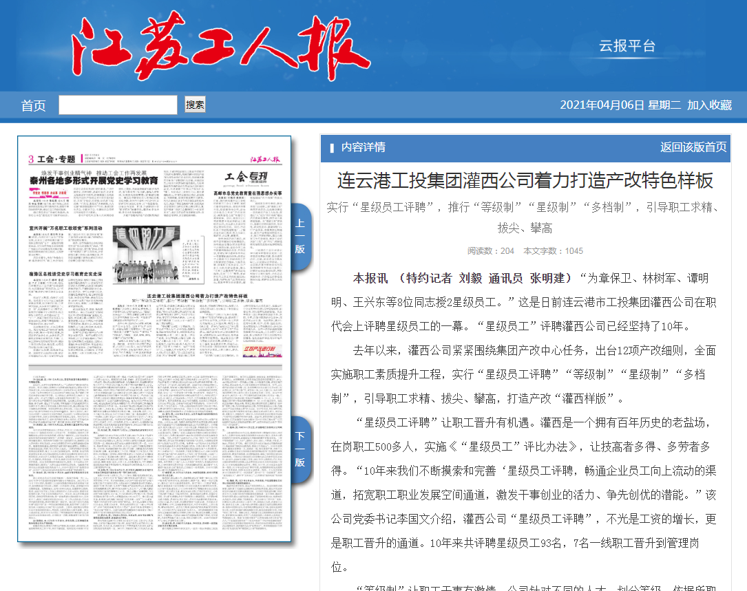 “星級員工評聘”讓職工晉升有機遇。灌西是一個擁有百年歷史的老鹽場,在崗職工500多人,實施《“星級員工”評比辦法》,讓技高者多得、多勞者多得。“10年來我們不斷摸索和完善‘星級員工評聘,暢通企業員工向上流動的渠道,拓寬職工職業發展空間通道,激發干事創業的活力、爭先創優的潛能。”該公司黨委書記李國文介紹,灌西公司“星級員工評聘”,不光是工資的增長,更是職工晉升的通道。10年來共評聘星級員工93名,7名一線職工晉升到管理崗位。