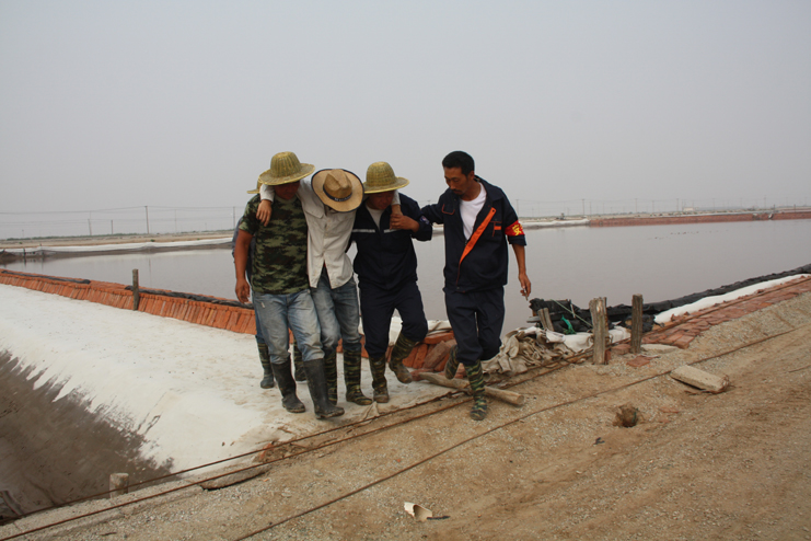 在這次的安全演練活動中,投資公司運營監管部部長李長軍主持了這次的安全演練活動,新河制鹽分公司九班全體員工參與演練。演練模擬現場,氣溫高達32.度,天氣悶熱,讓人透不過氣,灘上幾名工人正在頭排格勞動,有的在整理塑料繩,有的在整理防風布,其中一名蹲在格堰旁邊整理防風布的男工,在直起身來擦汗時,突然暈倒,癱坐在格堰旁,旁邊的工人連忙停下手中工作,將病員扶平躺下,同時喊班長來。在班長的指揮下,幾人一齊將病人扶到值班室前通風處,一邊為病人降溫、喂藿香正氣水和淡鹽水進行救護,一邊逐級向公司安全負責人匯報情況。公司領導來到現場了解情況,查看病情,撥打急救電話組織施救,并向公司運營監管部和領導報告。在救援過程中,大家各司其職,齊心協力,配合默契,有條不紊成功完成了此次演練活動。通過這次應急演練,進一步提高了公司員工應對緊急事件的自我保護和防衛能力,保證員工在發生突發事件時,能熟練應對、有序救援,最大限度地減少事故帶來的損害,切實保護員工的安全。