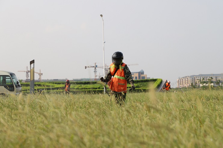 連日來,在臨港產業區辦公樓前,我們看到幾名南翼綠化公司的工人正在草坪上揮動割草機,忙碌的進行著除草作業。據了解,為了避開高溫時段,他們早上6點就開始工作,許多綠化工人都是五點多在家匆忙吃完早飯就趕往工作現場,有的甚至空腹上陣。工作現場,在經過一個夏天的生長,不少地方的雜草都近半米高,草叢內還有不少的碎石子等雜物,為了做好自身防護,工人們穿著厚厚的衣褲,戴著口罩、頭盔,肩扛除草機,一工作就是一上午。雖然近階段氣溫逐漸下降,但近30°的氣溫還是讓工人們吃不消。為了盡快完成工作目標,每一名工人都在咬牙堅持,默默地為更多的人營造一個優美、整潔的環境而做出自己的貢獻。(封楊)
