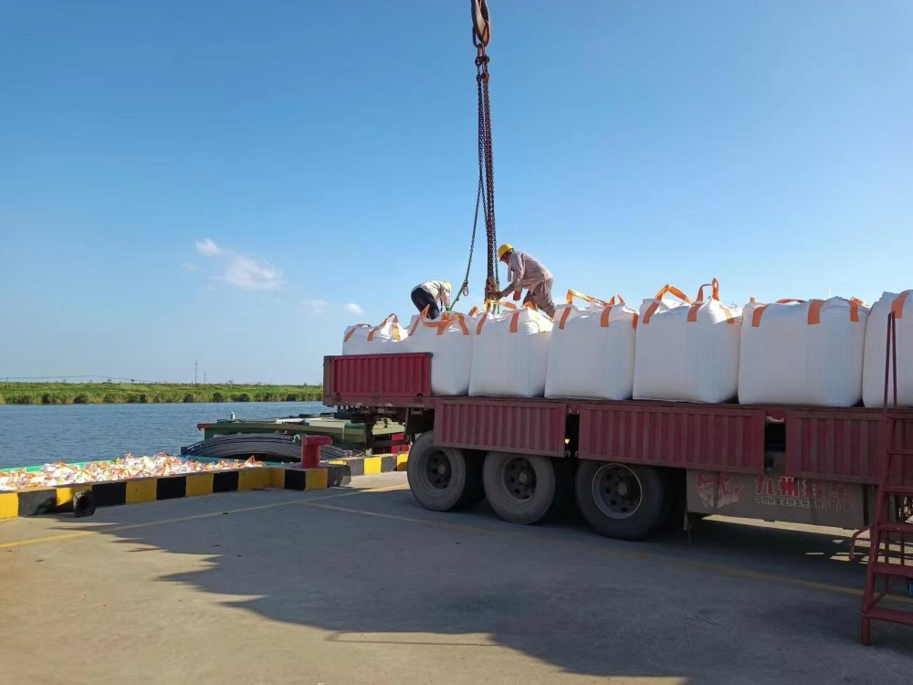 在火辣辣的太陽無情地照射下,一群勤勞的碼頭工人們正在調度著車輛和船只的進出,確保噸袋運輸過程的順暢無阻。另外幾個工人正操縱著高大的吊機,他們小心翼翼地裝卸著貨物,每一個動作都顯得格外謹慎。整個碼頭被一種熱烈而緊張的“高溫”氛圍所籠罩,仿佛連空氣都因為這份熱情而變得灼熱起來。