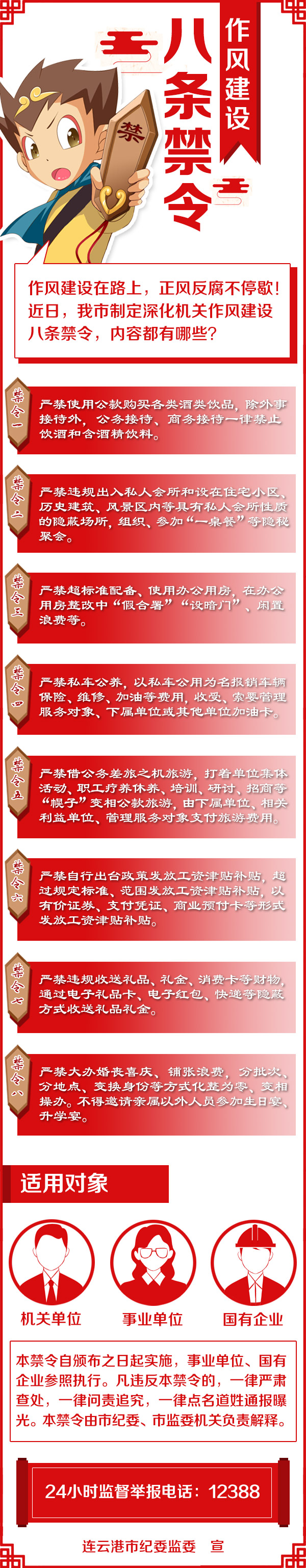 本禁令自頒布之日起實施,事業(yè)單位、國有企業(yè)參照執(zhí)行。凡違反本禁令的,一律嚴肅查處,一律問責(zé)追究,一律點名道姓通報曝光。本禁令由市紀委、市監(jiān)委機關(guān)負責(zé)解釋。24小時監(jiān)督舉報電話:12388。