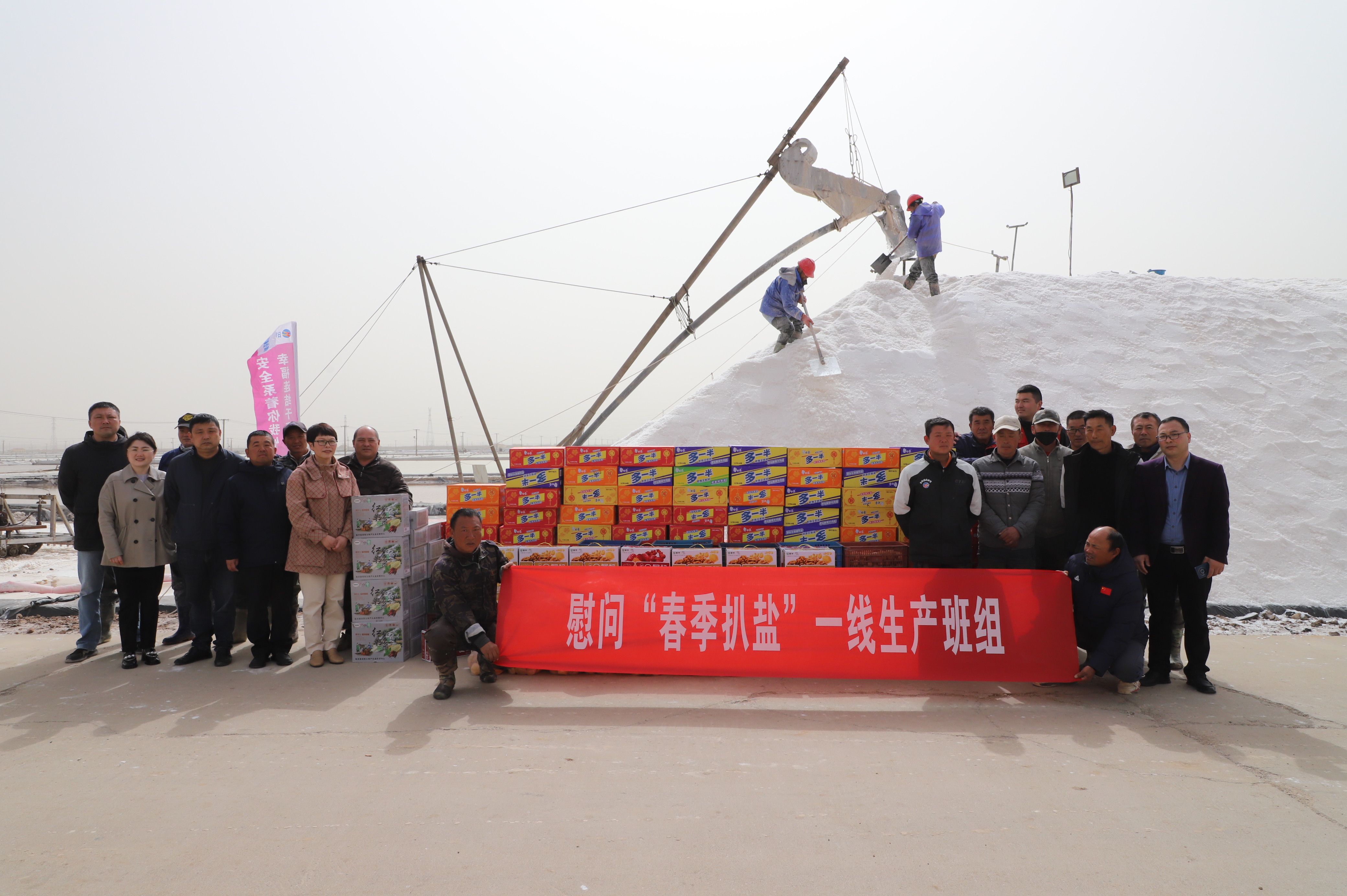 “你們辛苦了,我代表公司來看望大家。”在新河九班與埒南九班,王宏與扒鹽現場職工握手問好,感謝他們在過去的一年為日曬制鹽公司的原鹽生產所付出的辛勤努力,叮囑他們一定要落實落細扒鹽生產措施,增強責任感和警覺性,嚴格執行各項規章制度,切實保障扒鹽期間的安全生產,并送上雞蛋、八寶粥、方便面、牛奶等物品。