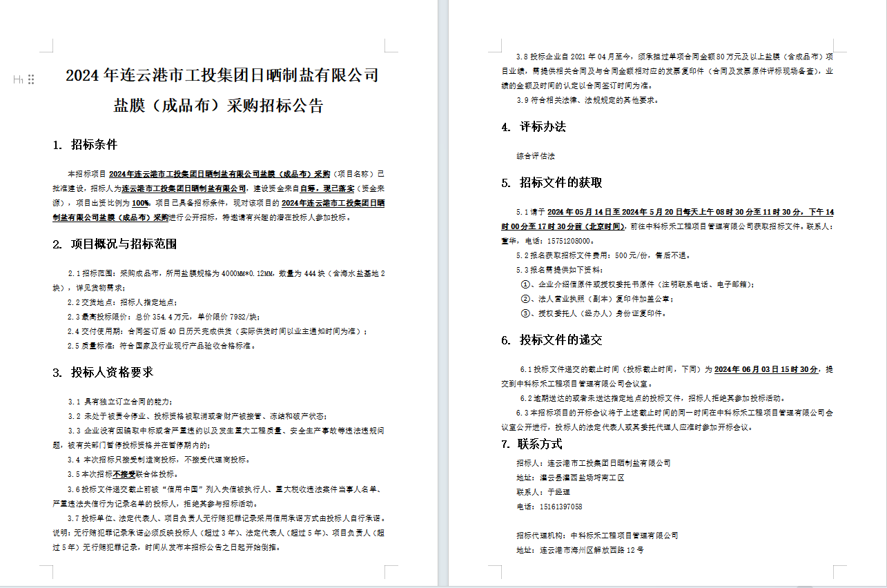 2024年連云港市工投集團日曬制鹽有限公司鹽膜(成品布)采購招標公告