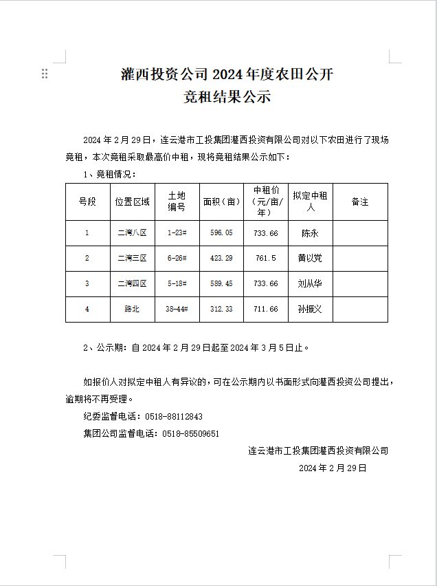 灌西投資公司2024年度農田公開競租結果公示