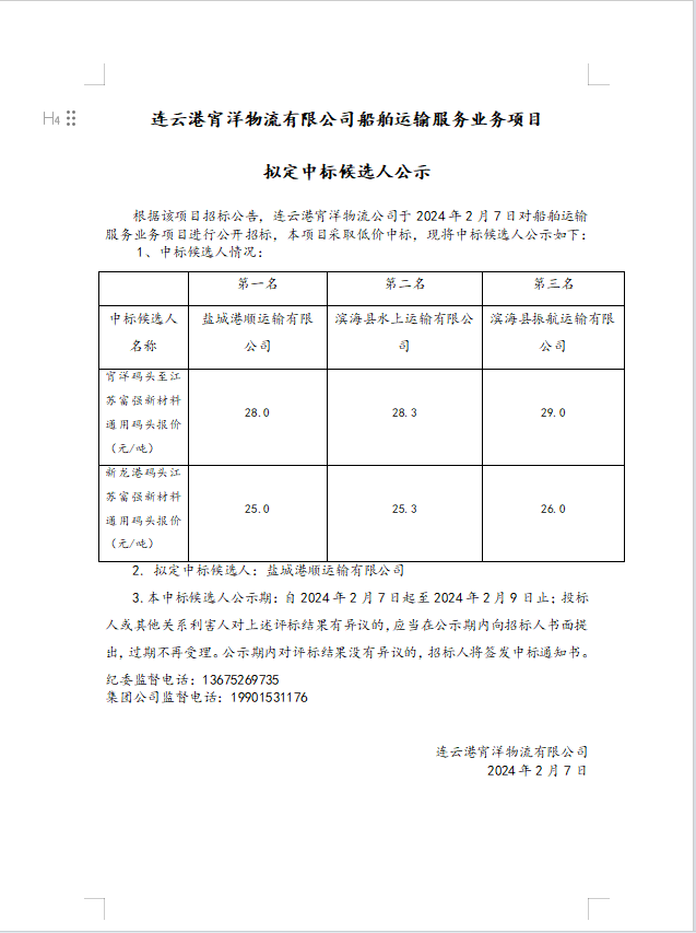 連云港宵洋物流有限公司船舶運輸服務業(yè)務項目擬定中標候選人公示