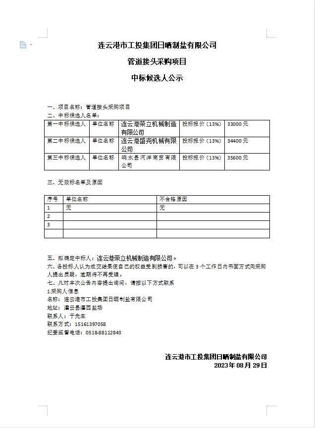 連云港市工投集團日曬制鹽有限公司 管道接頭采購項目中標候選人公示