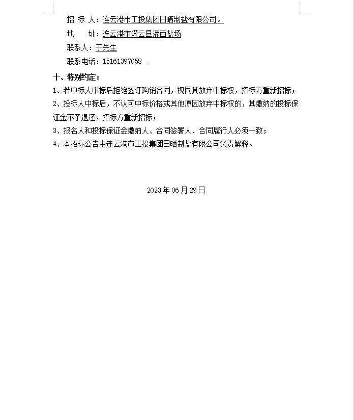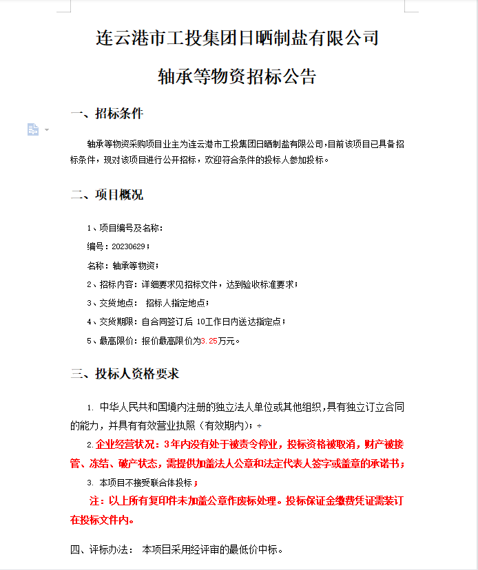 連云港市工投集團日曬制鹽有限公司軸承等物資招標公告