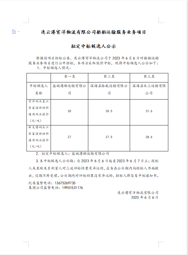 連云港宵洋物流有限公司船舶運輸服務業務項目擬定中標候選人公示
