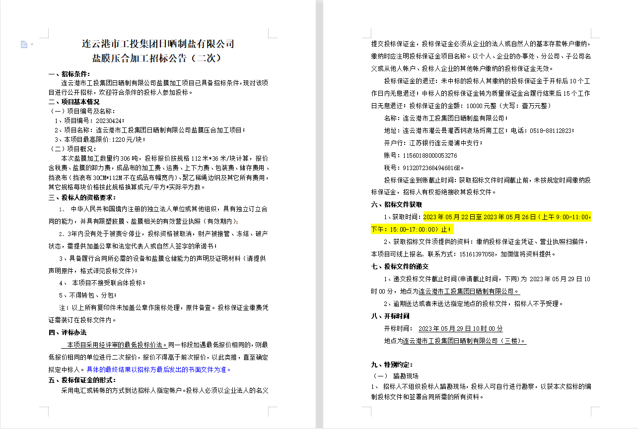 連云港市工投集團日曬制鹽有限公司鹽膜壓合加工招標公告(二次)