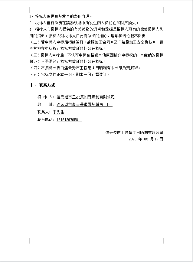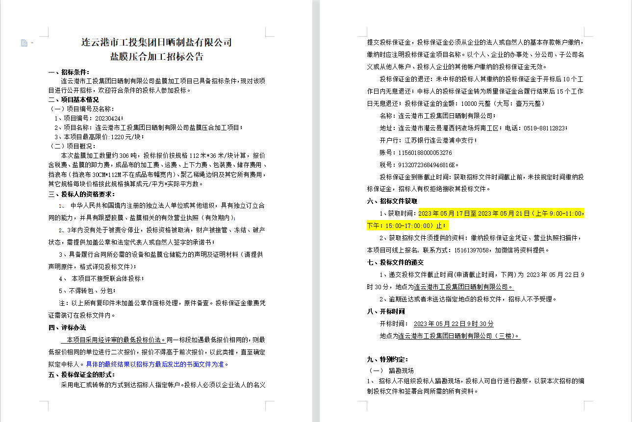 連云港市工投集團(tuán)日曬制鹽有限公司鹽膜壓合加工招標(biāo)公告