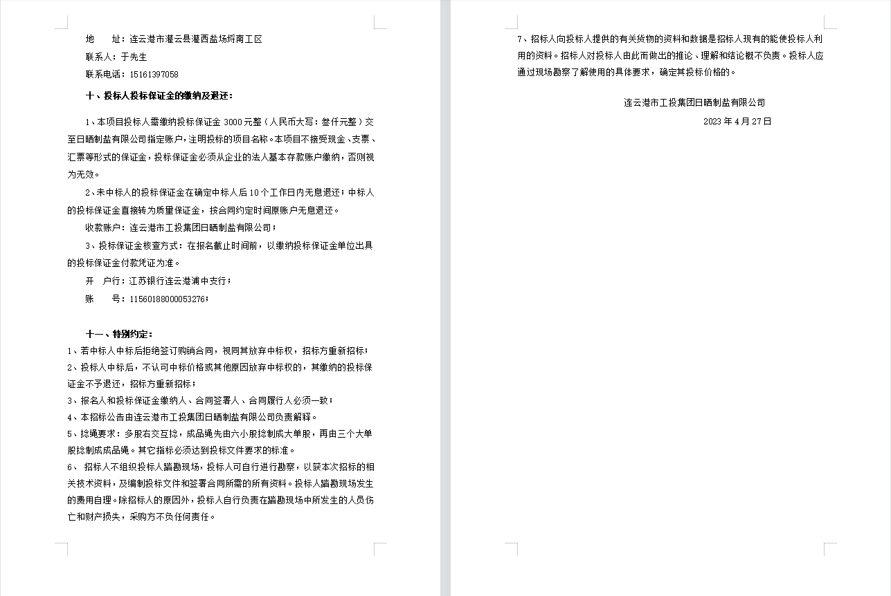 連云港市工投集團(tuán)日曬制鹽有限公司聚乙烯繩采購(gòu)項(xiàng)目招標(biāo)公告